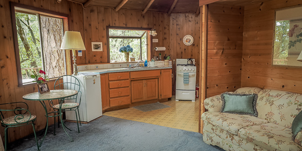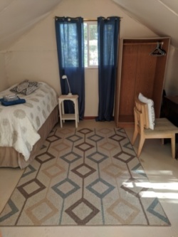 Kindness is a comfortable studio cabin, offering an attractive haven just outside the healing gardens’ fence. Kindness is one of our more conveniently located cabins, with a short walk to dining room, lounge and temples.