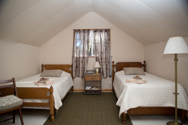 Happiness lodge is a delightful group accommodation for women with five private bedrooms, each with a twin bed, table, chair, and bedside lamp.