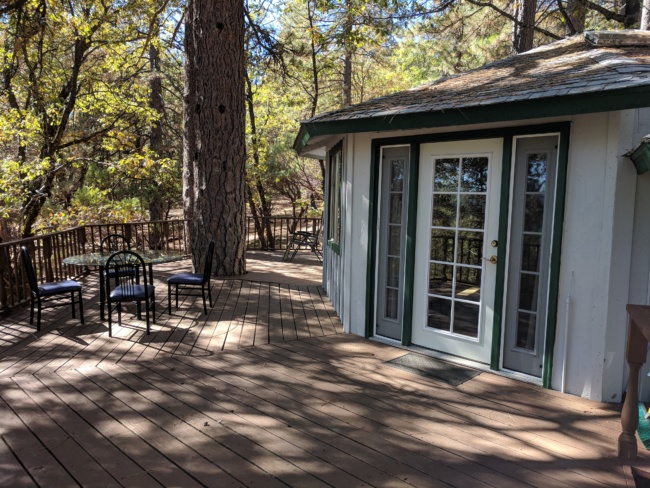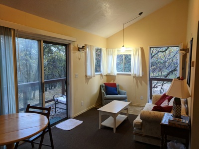 Krishna is one of our more conveniently located cabins, with a short walk to dining room, lounge and temples. The sunny deck overlooks a gorgeous oak tree grove.
